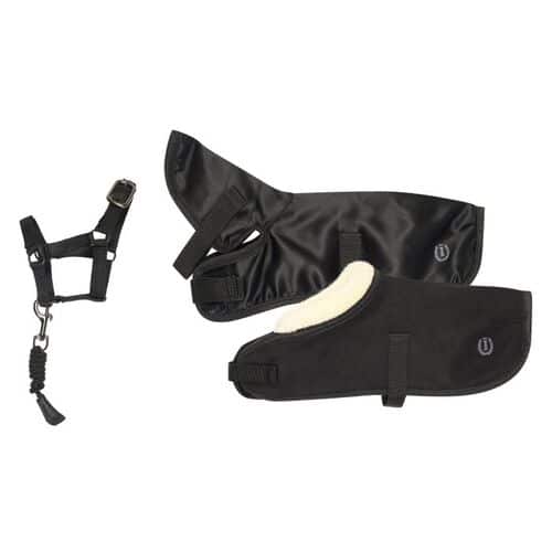 Sættet består en en fin grime med træktov, et fleecedækken med plyskant ved halsen og et udedækken med hals.