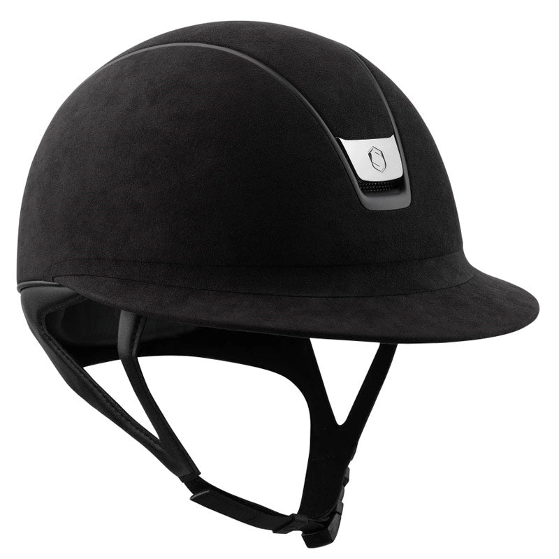 Vigtigt at bemærke at hjelmen er med mørk Chrome og ikke lys. Fantastisk ridehjelm af Premium kvalitet i elegant sort med hagerem. Ydersiden af hjelmen er lavet af sort Alcantara, som er imiteret ruskind, og trimmen langs siderne er i flot mat sort Balzon