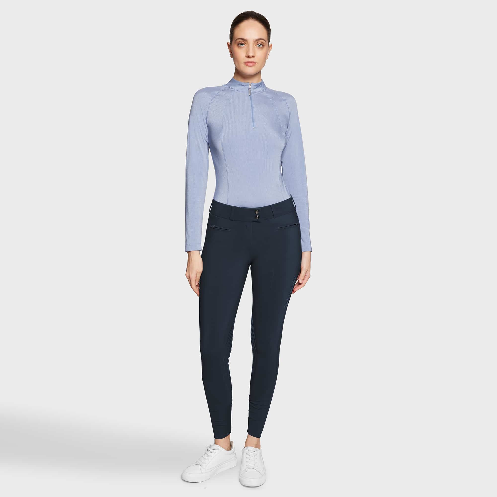 Samshield Chloe Metal Dots Knæ Grip Navy kombinerer teknisk performance med et stilrent og eksklusivt udtryk. Bukserne er designet til ryttere, der ønsker maksimal komfort, funktionalitet og elegance både til træning og stævner.