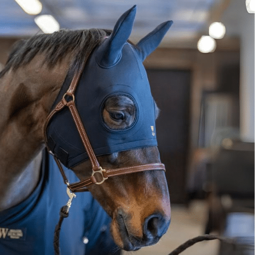 Den er med huller til ører og justerbar velcrolukning under hestens kæbe.